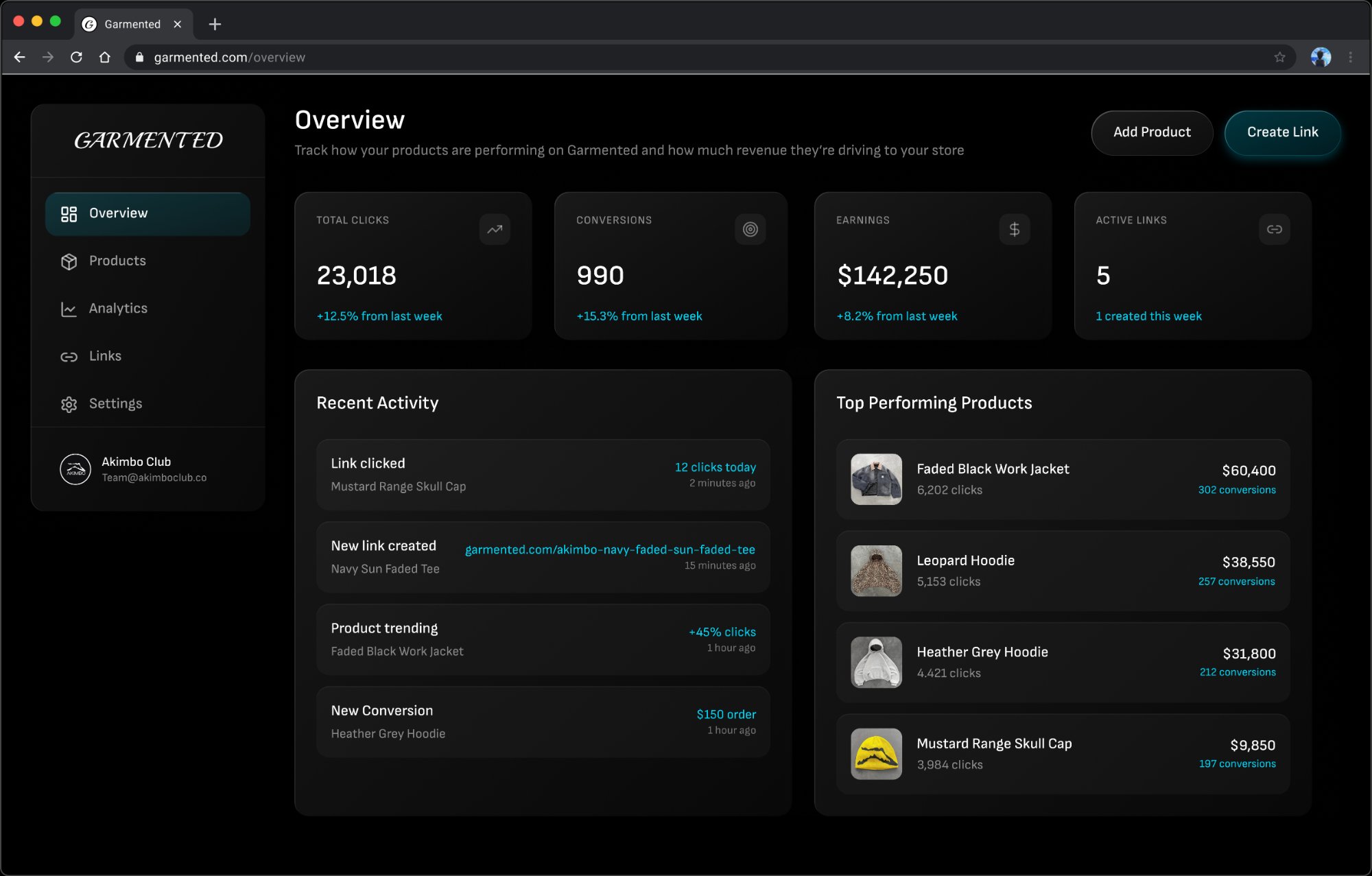 Track clicks, conversions, and revenue across every product you share on Garmented. Quickly understand what's gaining traction and what needs attention.